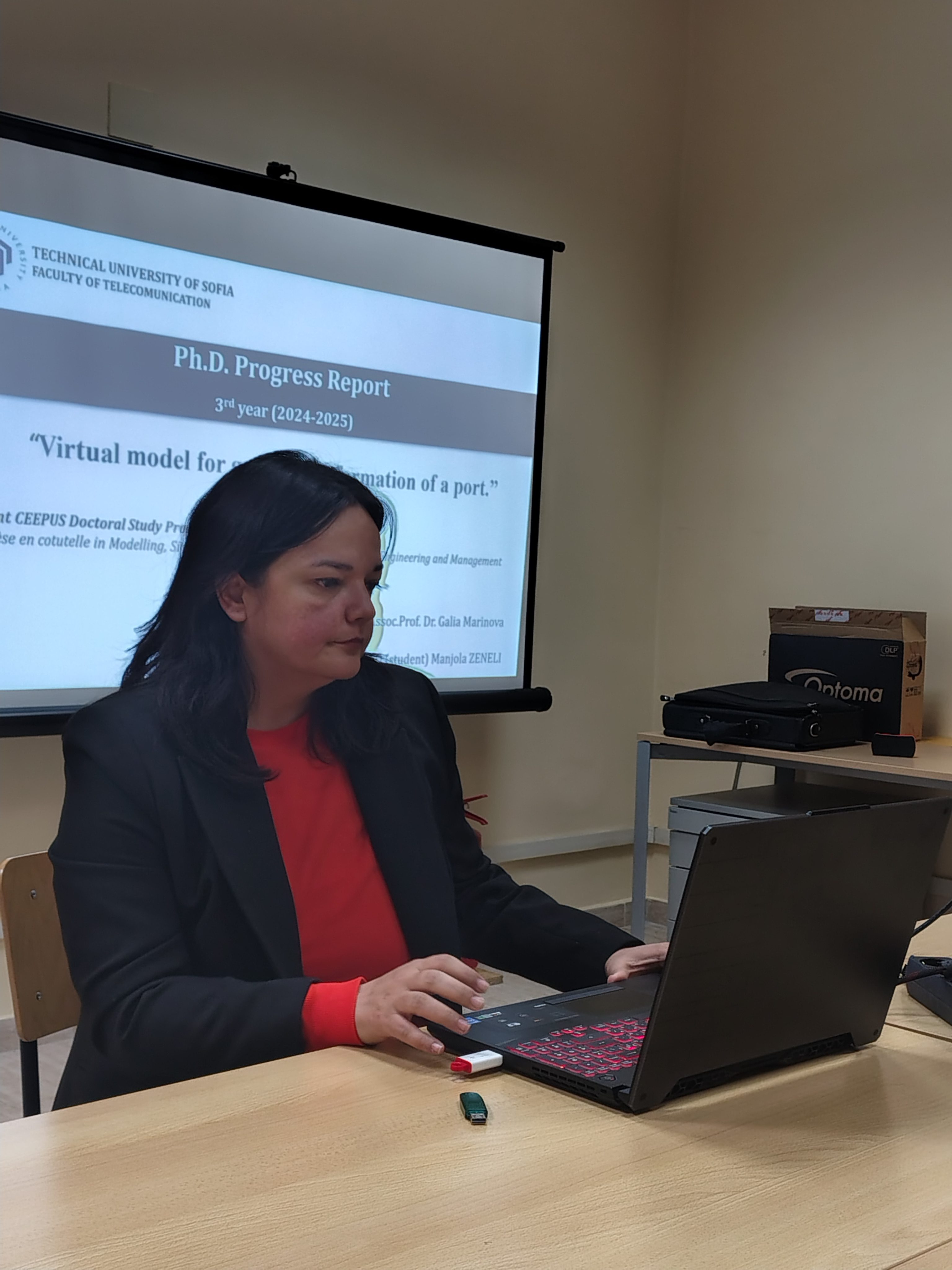 The doctoral students Manjola Zeneli from UAMD, Durres, Albania, on CEEPUS mobility in TU-Sofia, presenting the progress of her thesis to the Department council, 14.04.2025